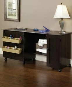 Sauder Folding Sewing & Craft Table/Storage Cart W/ Locking Wheels, Cinnamon Cherry Finish