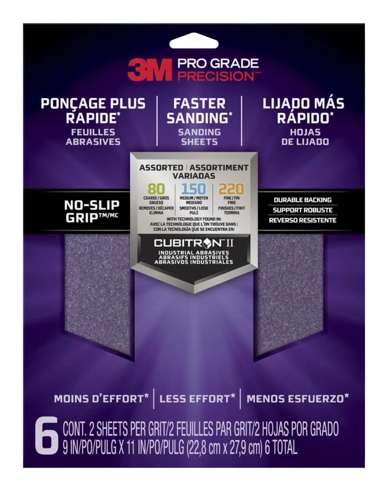 - 3M Pro Grade No-Slip Full Sheet Sandpaper features multiple grits for project sanding and finishing