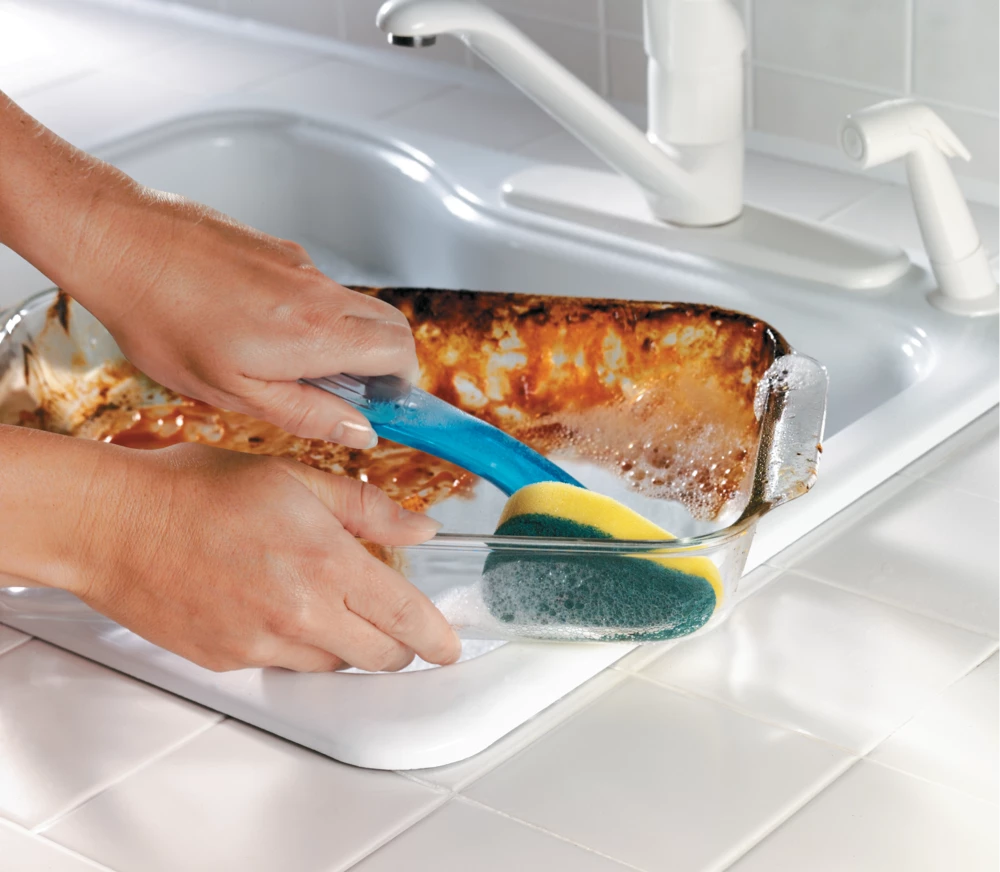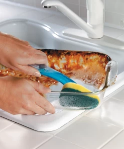 - 3M Scotch-Brite Heavy-Duty Dishwand effectively cleans tough, baked-on messes, but is gentler than heavy duty scrubbers