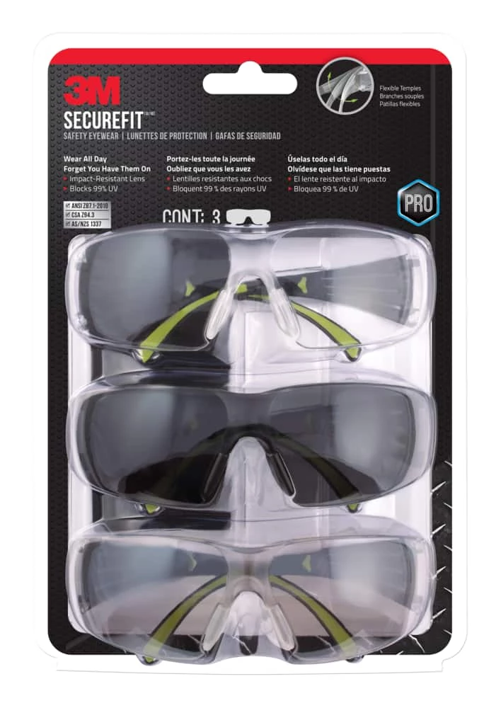 - 3M™ SecureFit™ 400 Safety Glasses feature patented 3M™ Pressure Diffusion Temple Technology for a self-adjusted secure and comfortable fit