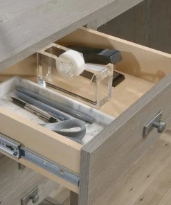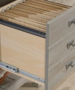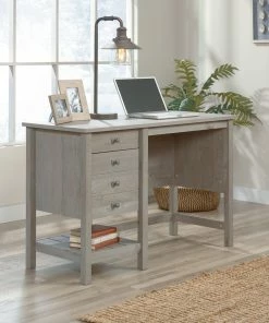 - Sauder Cottage Road Single Pedestal Desk with Storage features two drawers with full extension slides for paper, pens, and more