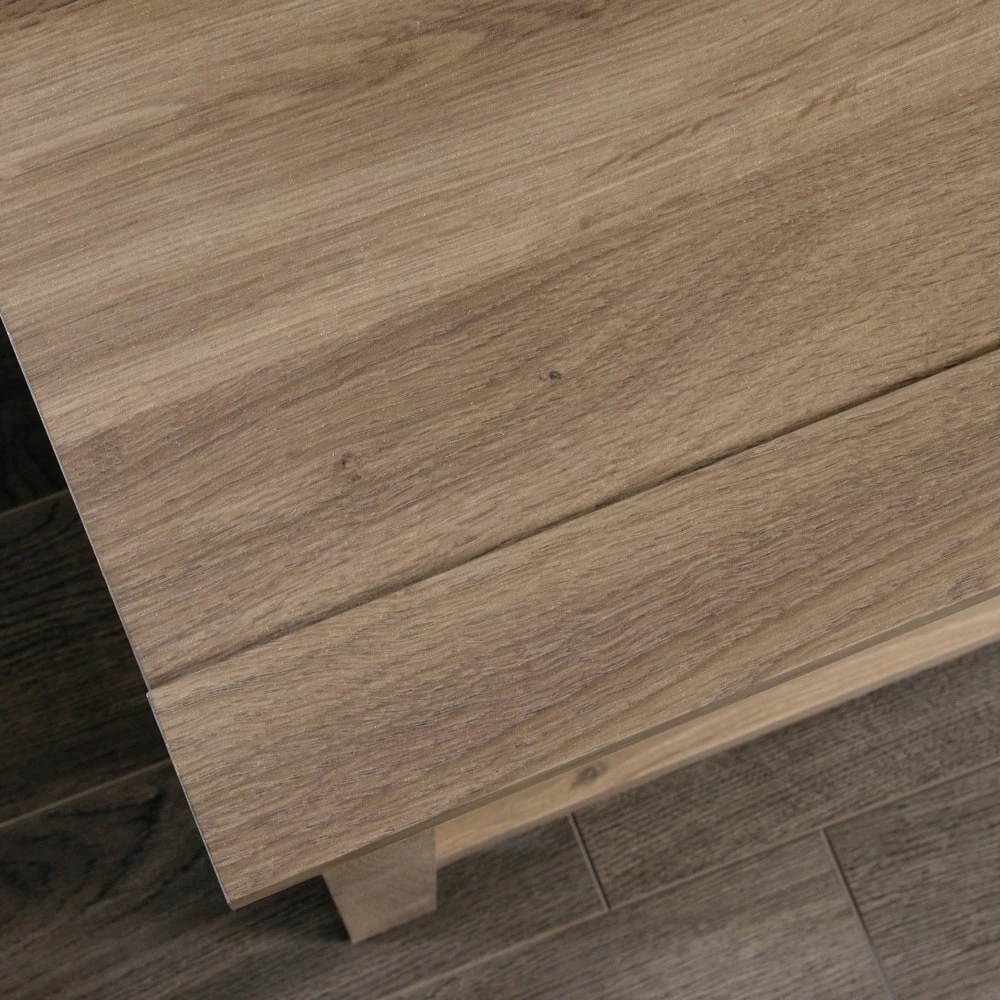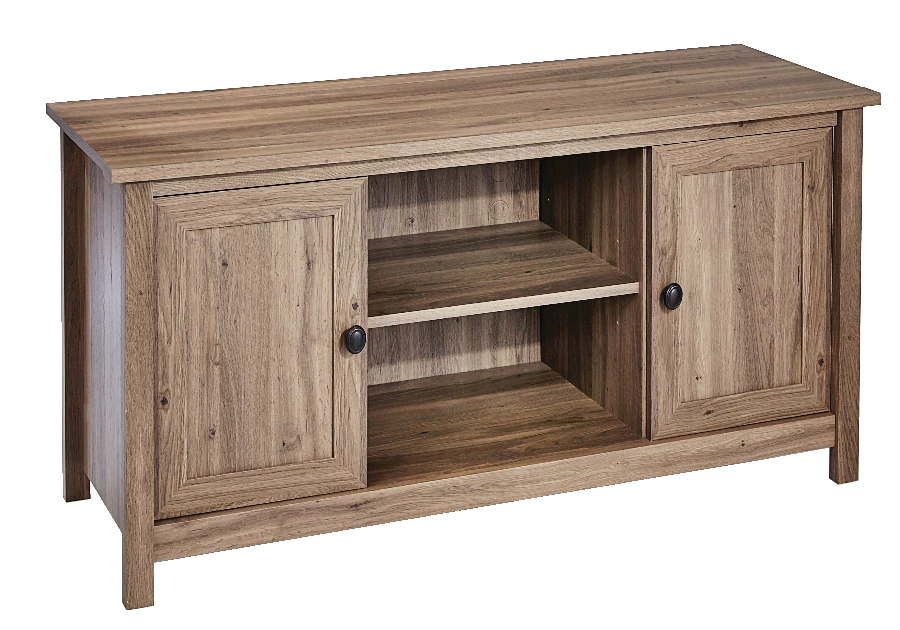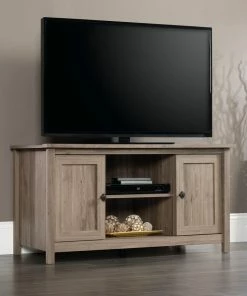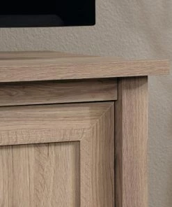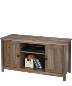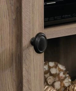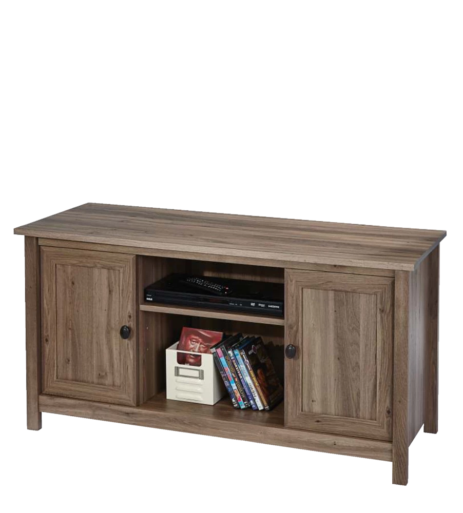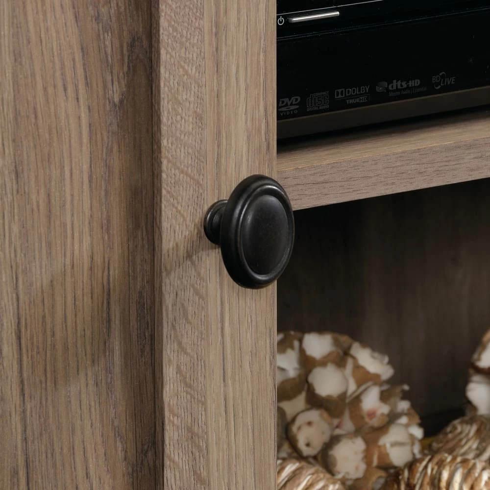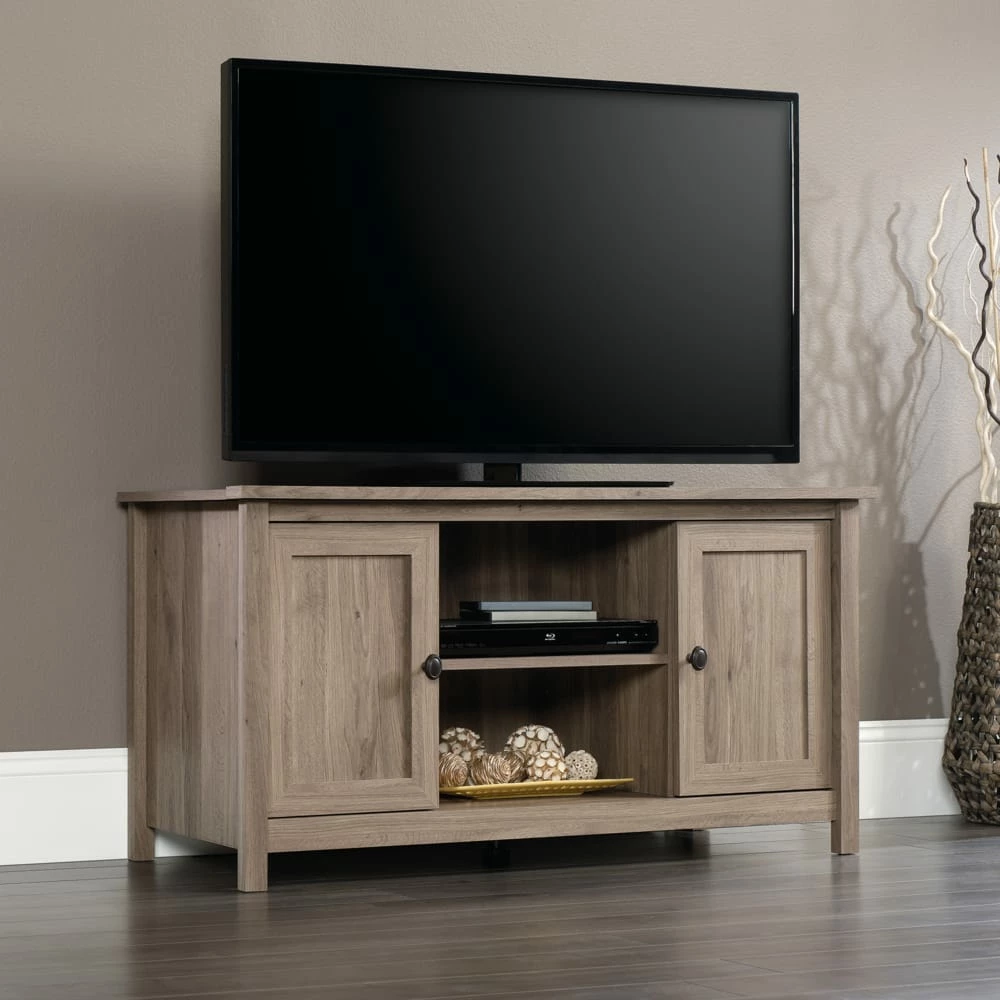 Sauder County Line TV Stand will be the apple of your eye with its rustic elegance and contemporary flair. With a warm yet sophisticated salt oak finish, framed doors with adjustable shelving, and easy cord access for flat screen TVs up to 47″, this versatile piece belongs in your home.