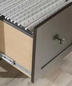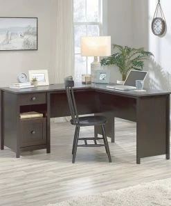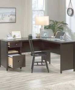 - Sauder County Line Home Office L-Desk with Storage features a file drawer with full extension slides that hold letter-size hanging files