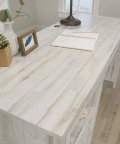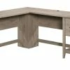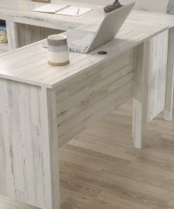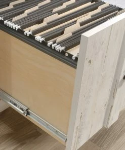 - Sauder Dakota Pass Easy-to-Assemble L-Desk with Storage features a file drawer with full extension slides to hold letter-size hanging files