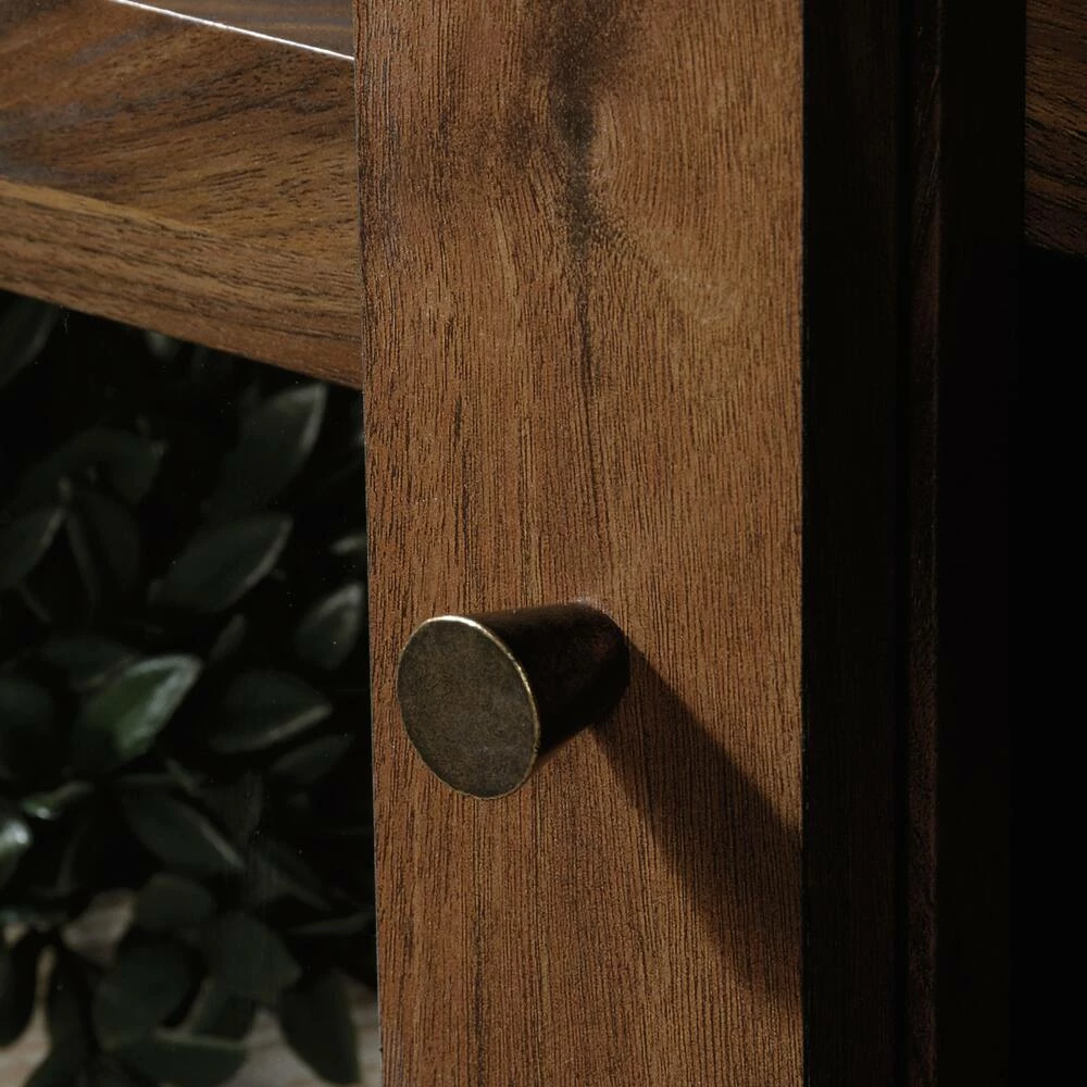 - Adjustable shelf behind each framed, safety-tempered glass door