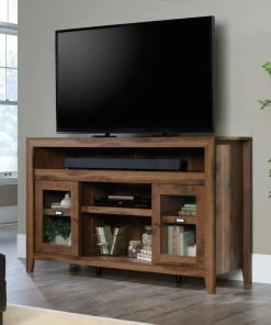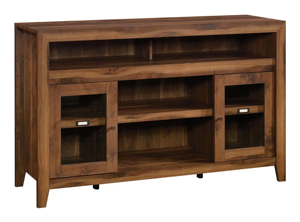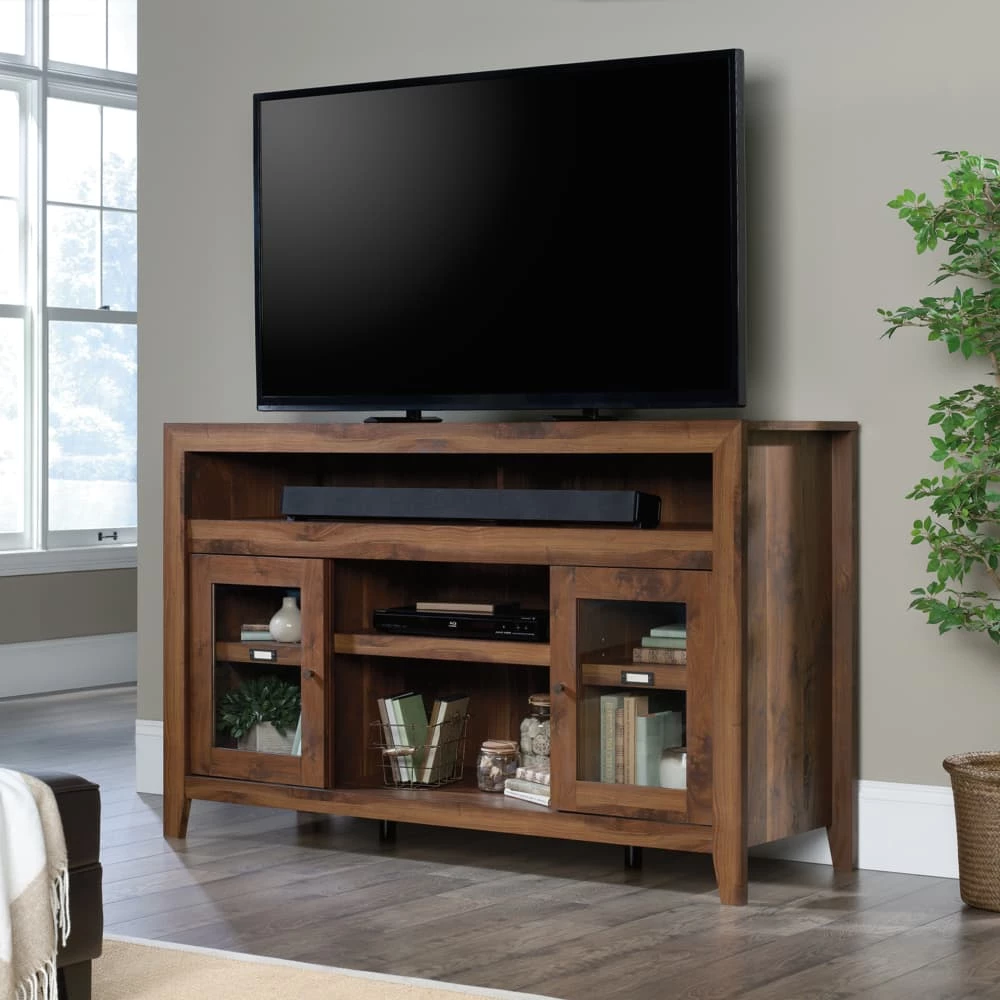 - Create a warm, entertaining space in your living room with this Sauder Dakota Pass Entertainment/Fireplace Credenza