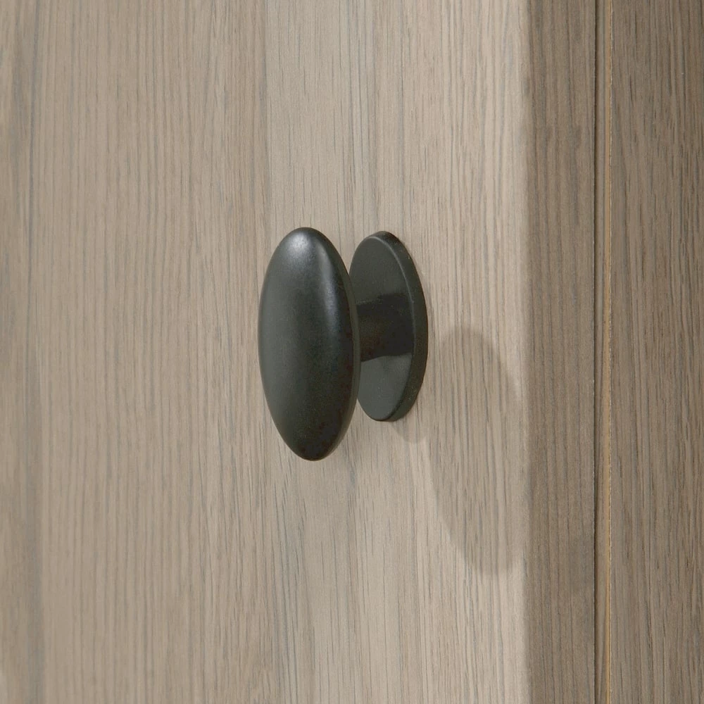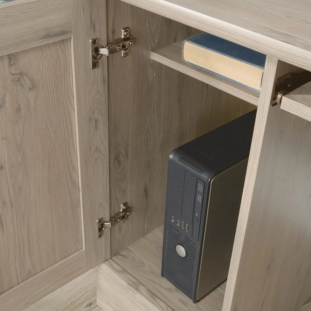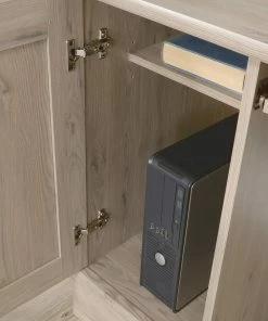 - Storage area behind door holds vertical CPU tower and has an adjustable shelf