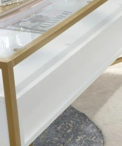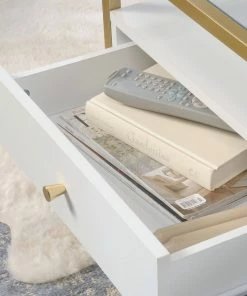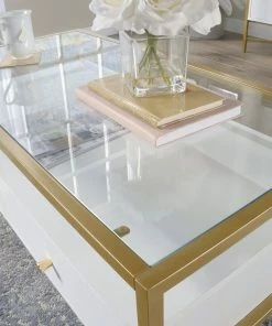 - Sauder Harper Heights Tempered Glass Top Coffee Table with Drawers features open shelving for storage and display of your favourite home décor