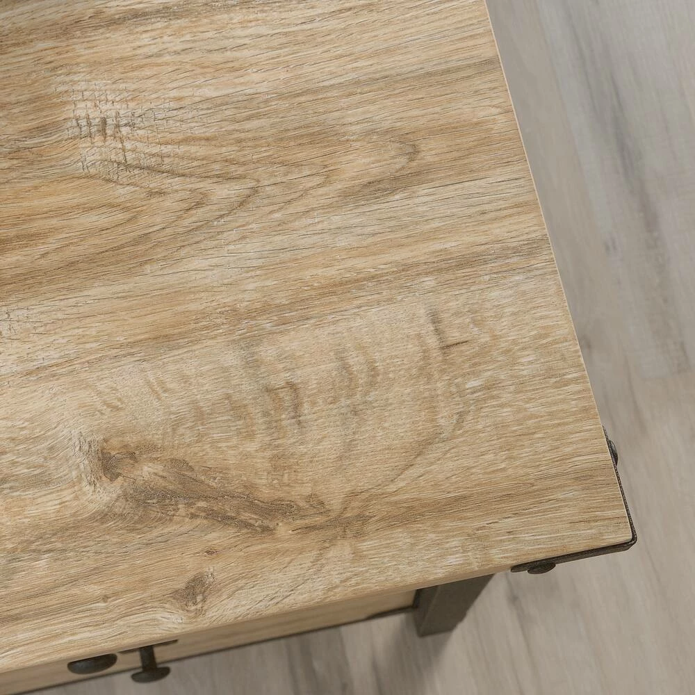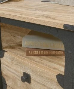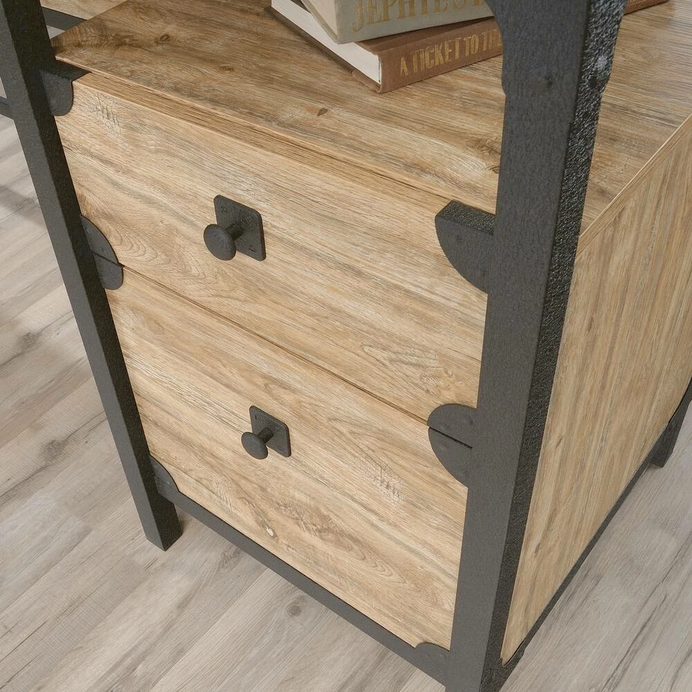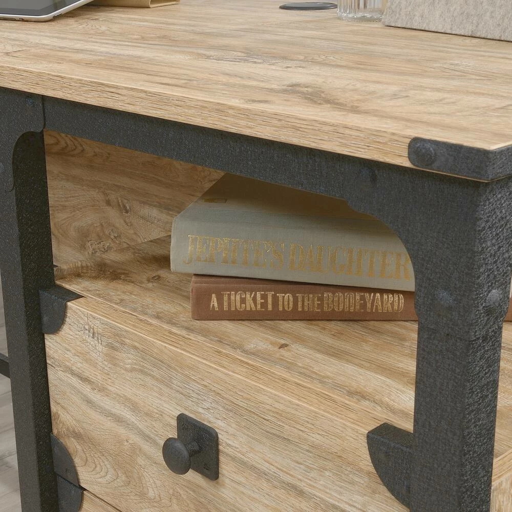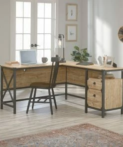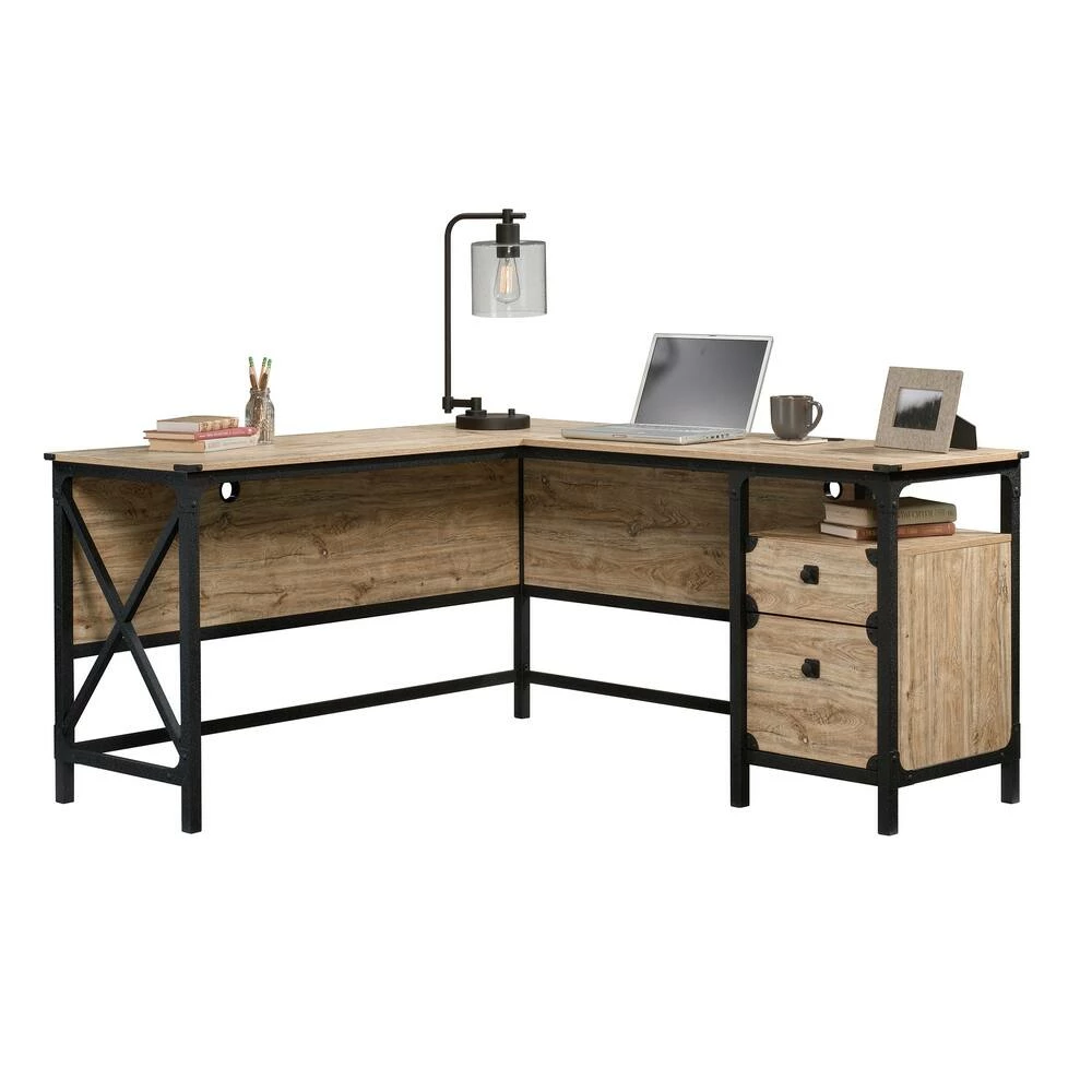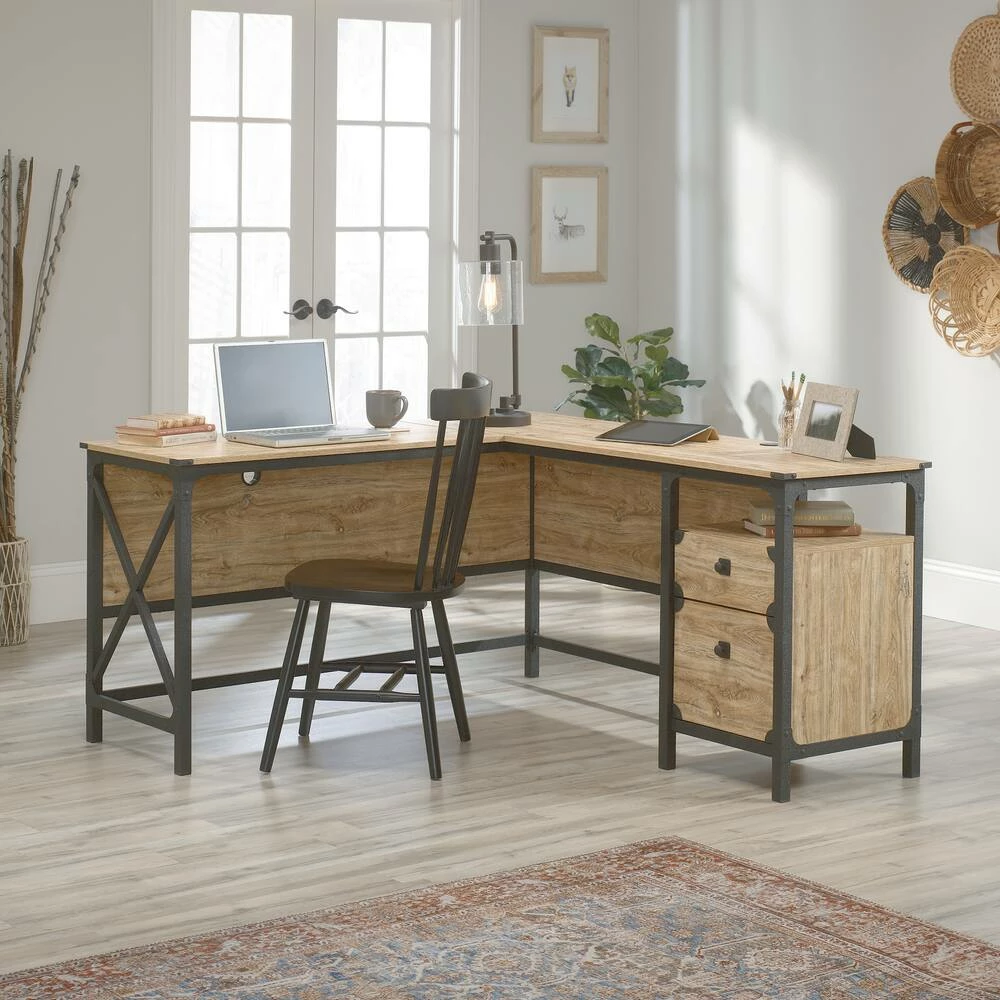- Sauder Steel River Home Office L-Desk with Drawers features a spacious work surface for laptop, notepads, lamp, etc