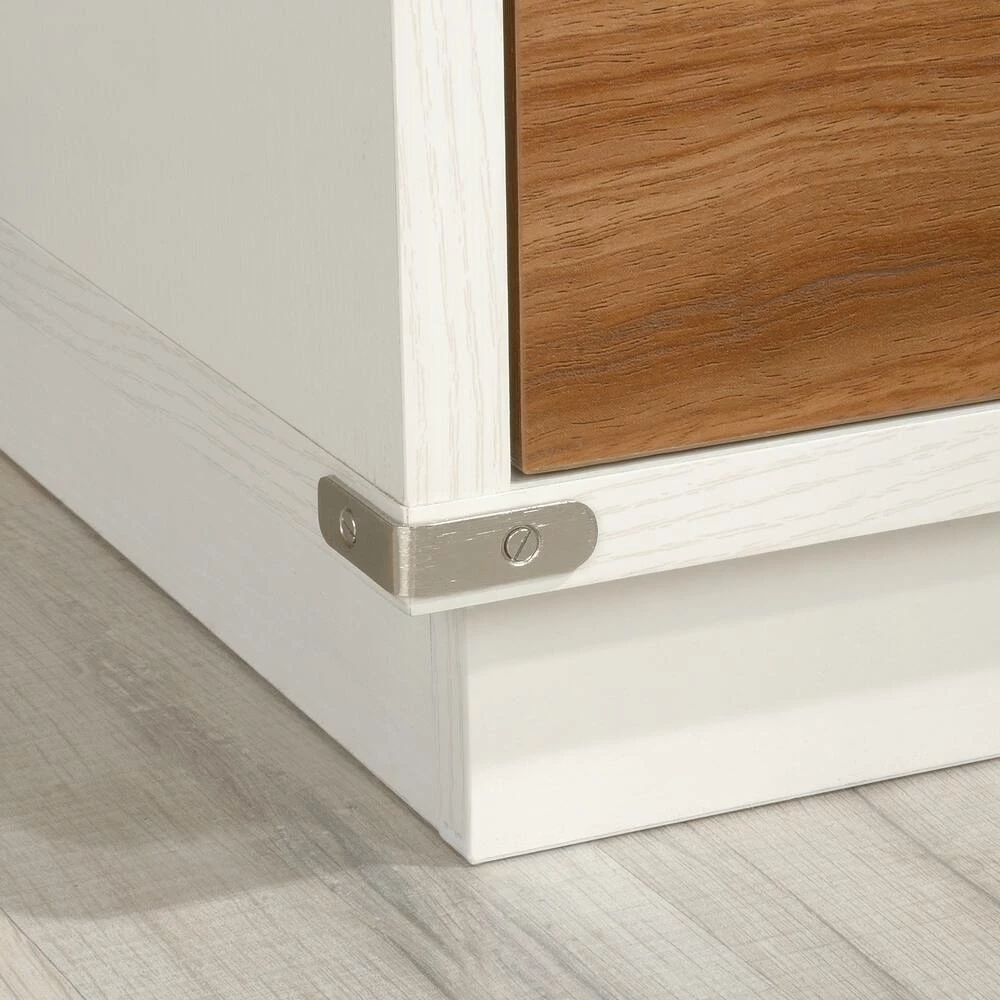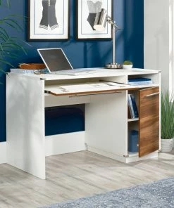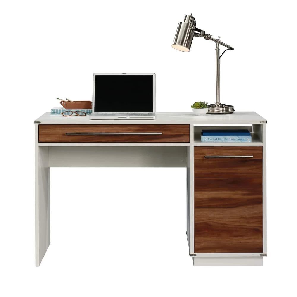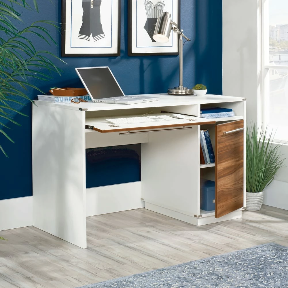 - Sauder Vista Key Single Pedestal Desk with Storage features flip-down front that reveals slide-out keyboard/mouse shelf with metal runners and safety stops