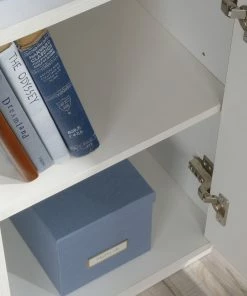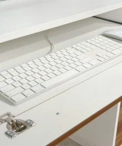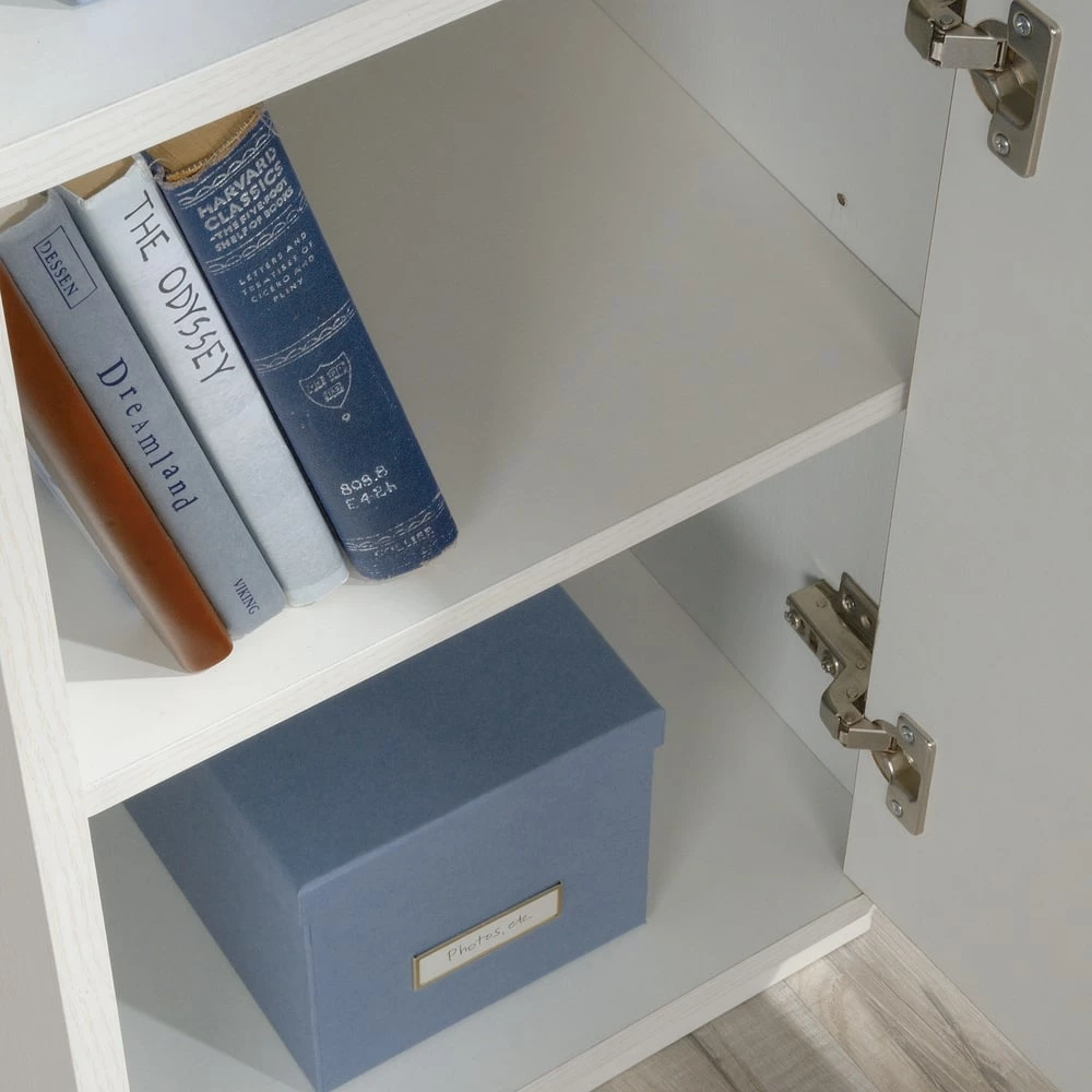 - Storage area behind door holds vertical CPU tower and has an adjustable shelf for flexible storage options